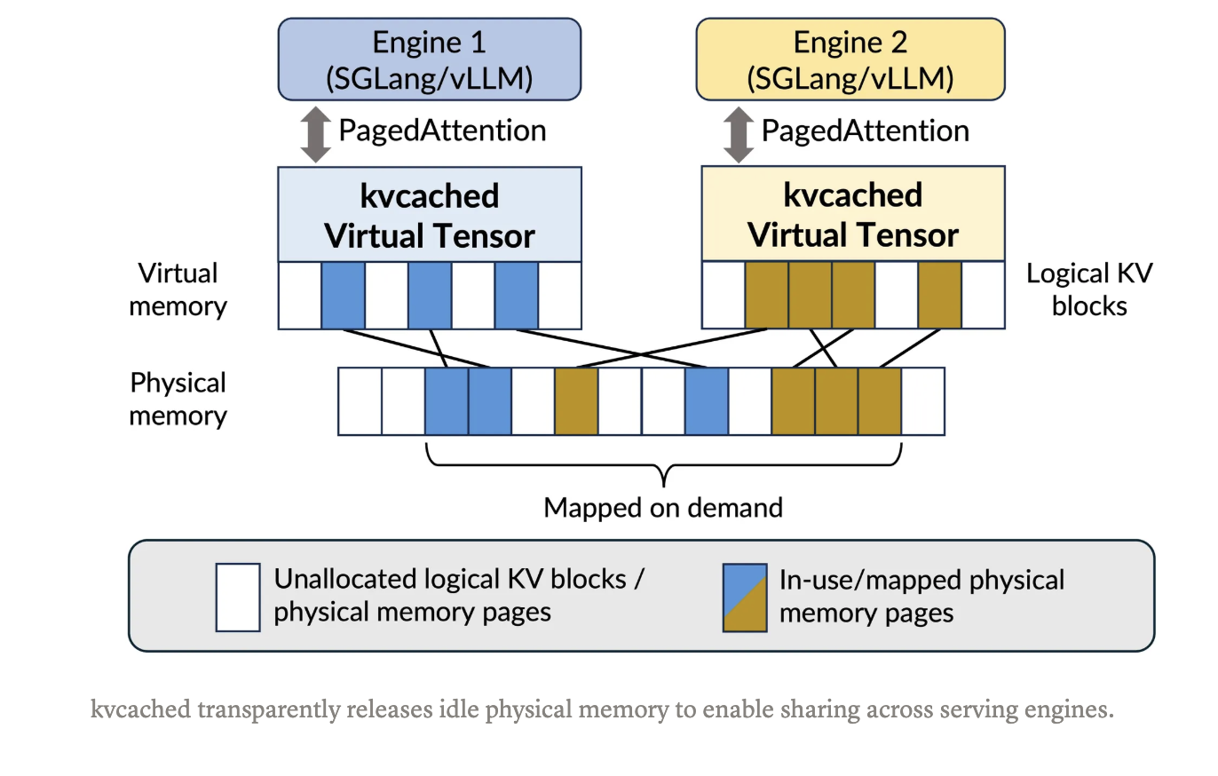 - kvcached virtualizes the KV cache using GPU virtual memory, engines reserve contiguous virtual space and map physical pages on demand, enabling elastic allocation and reclamation under dynamic loads.