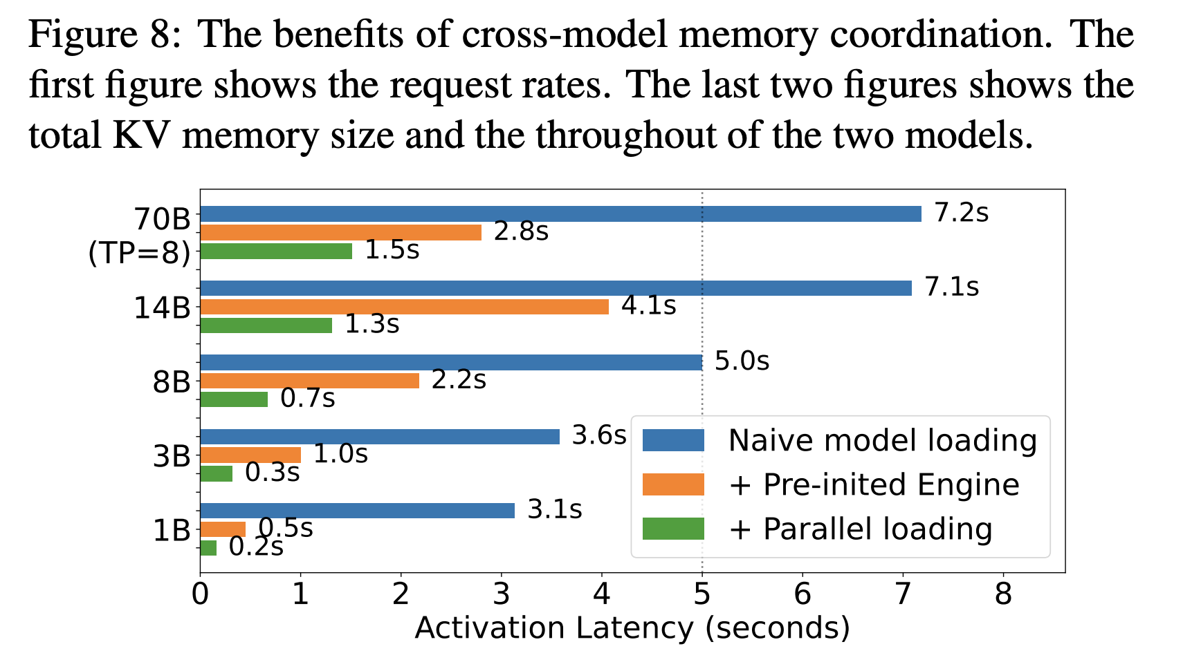 - For clusters that host many models with bursty, long tail traffic, virtualized KV cache allows safe colocation, faster activation, and tighter autoscaling, with reported activation around 0.7 seconds for an 8B model and 1.5 seconds for a 70B model in the Prism evaluation.