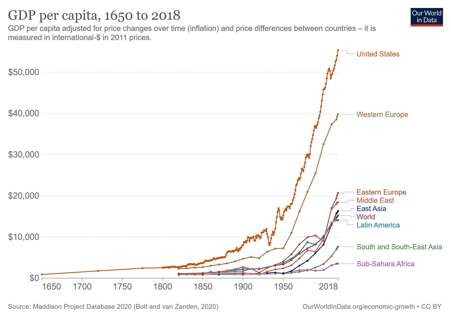 If you think about it, it’s pretty incredible that the world actually works that way. If you went up to someone in the year 1500 and told them that one kooky hobbyist rolling little balls down ramps could be right about how the physical world works, when the cumulated experience of millions of human beings around him was wrong, and that his insights could be written down by an even kookier kook in an arcane language that few could speak, and that this language would allow its speakers to apply the laws to do wondrous feats that others couldn’t possibly do, they would have thought you were crazy. They did think that was crazy. And yet, it worked. It worked more spectacularly than anything had ever worked before, and the economic result looked like this:
